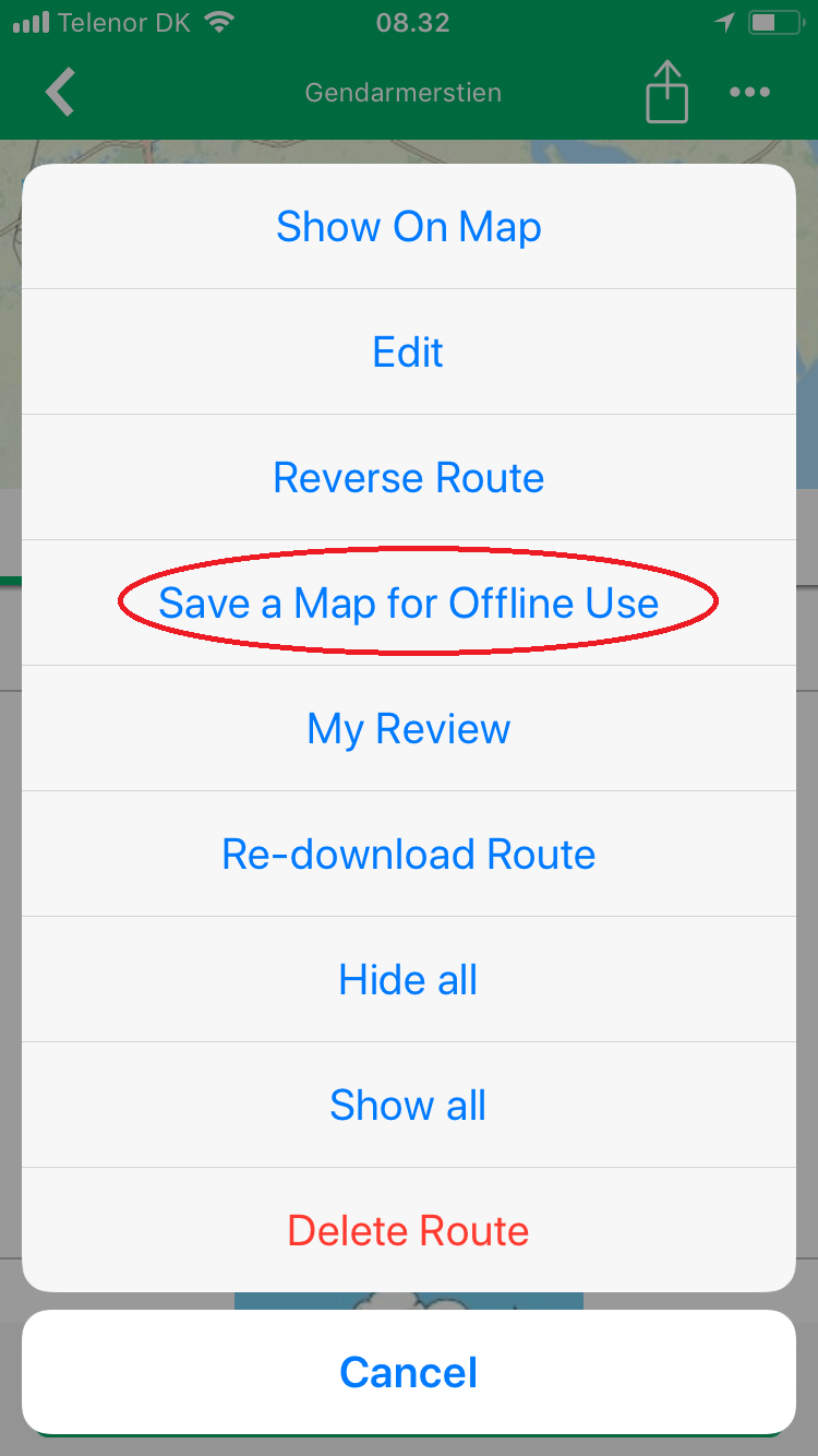 Og vælg “Save a Map for Offline Use”. Som sagt downloader den ud fra dit aktuelle kort, og den downloader langs ruten med lidt buffer på begge sider af ruten, så der er plads til at gå lidt forkert! Hvis du vil have mere buffer, skal du selv ind og pille og downloade kort manuelt hvilket er noget mere bøvlet.