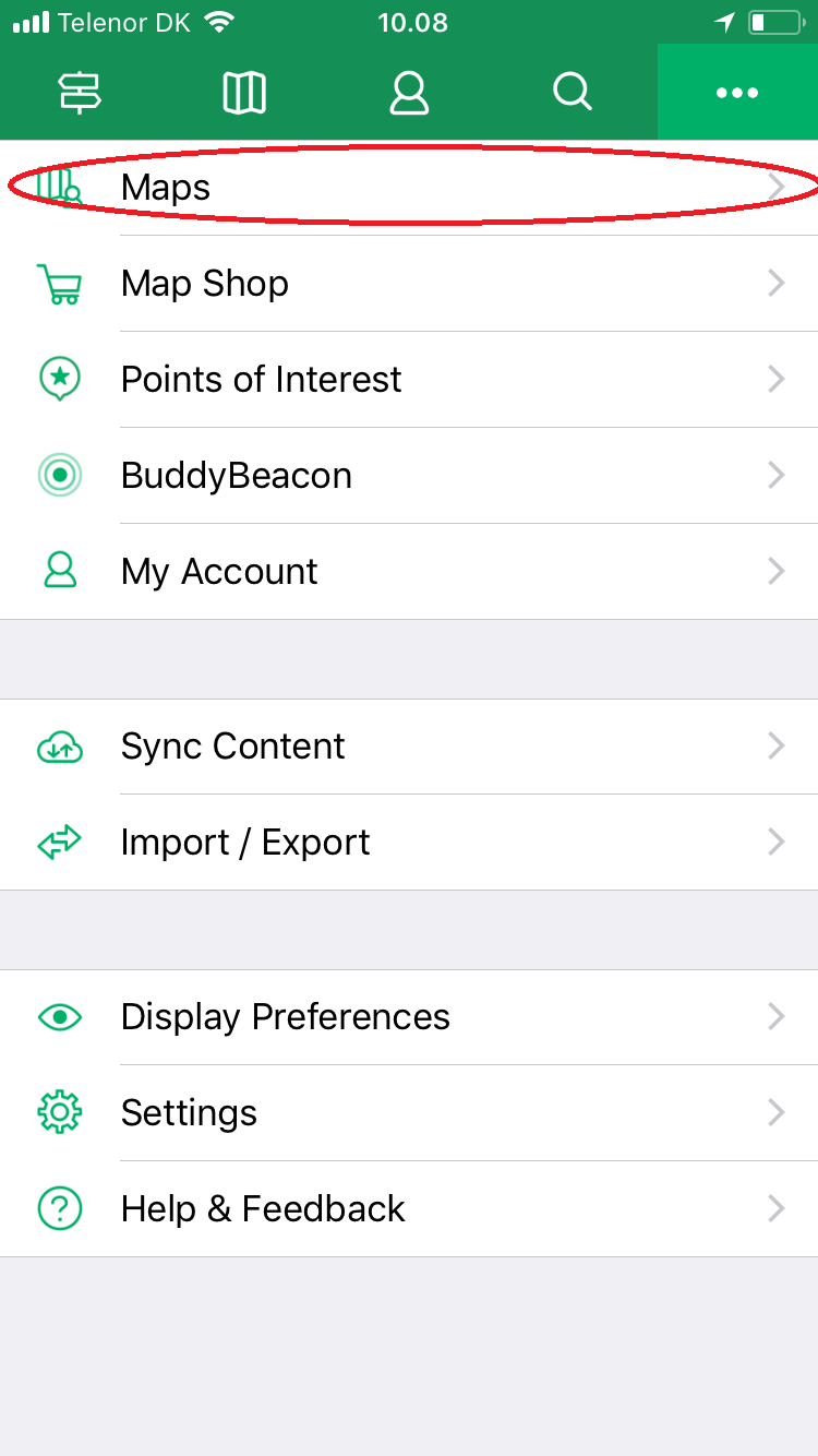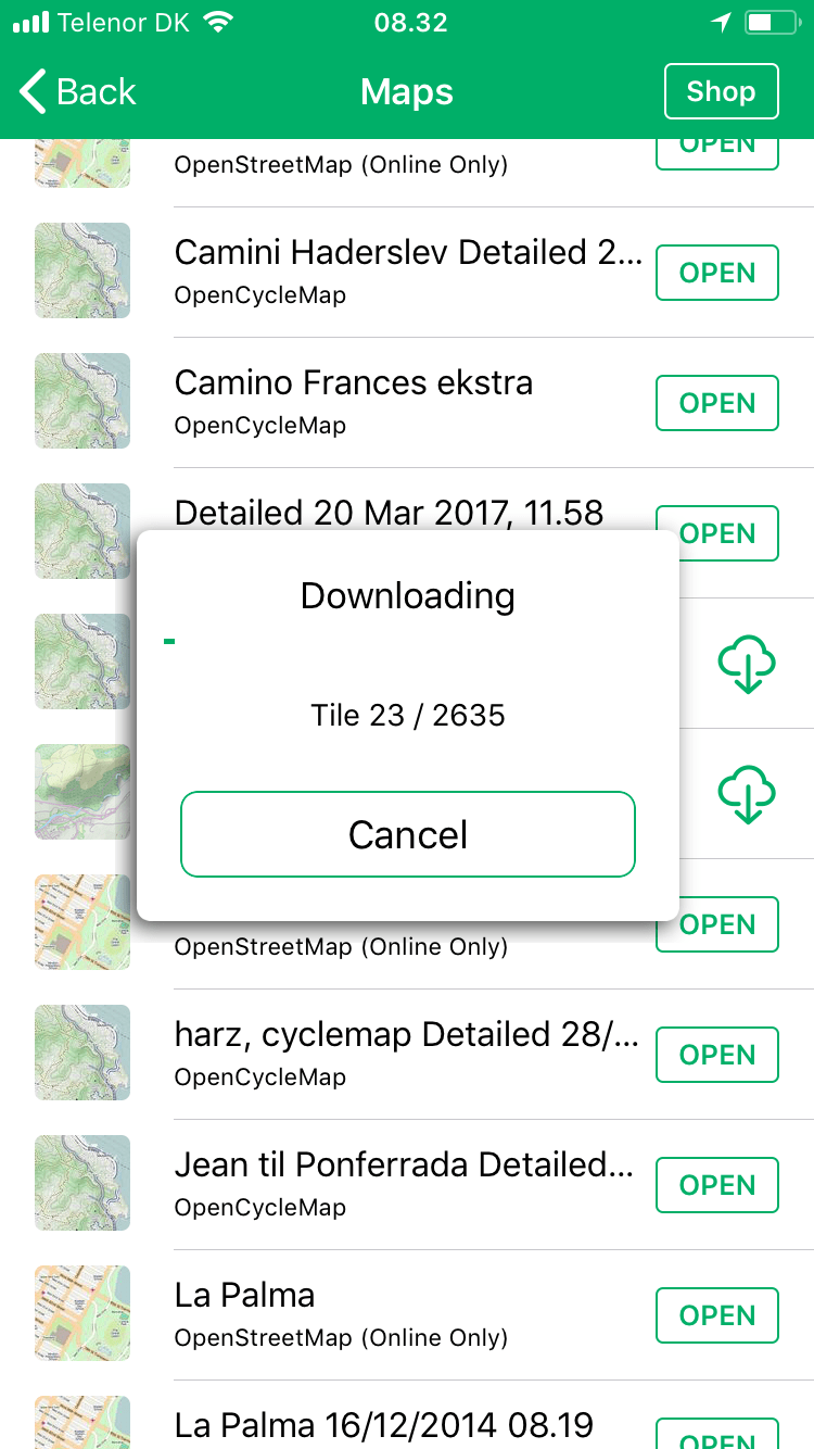 Sørg først for at du har valgt det kort som du vil hente fra – jeg foretrækker “ViewRanger Landscape”, da den er en videreudvikling af OpenStreetMap med fokus på vandreruter. Jeg har også tidligere brugt både OpenStreetMap og OpenCycleMap, som er udmærkere men har ikke helt så mange små stier som WireRanger Landscape.